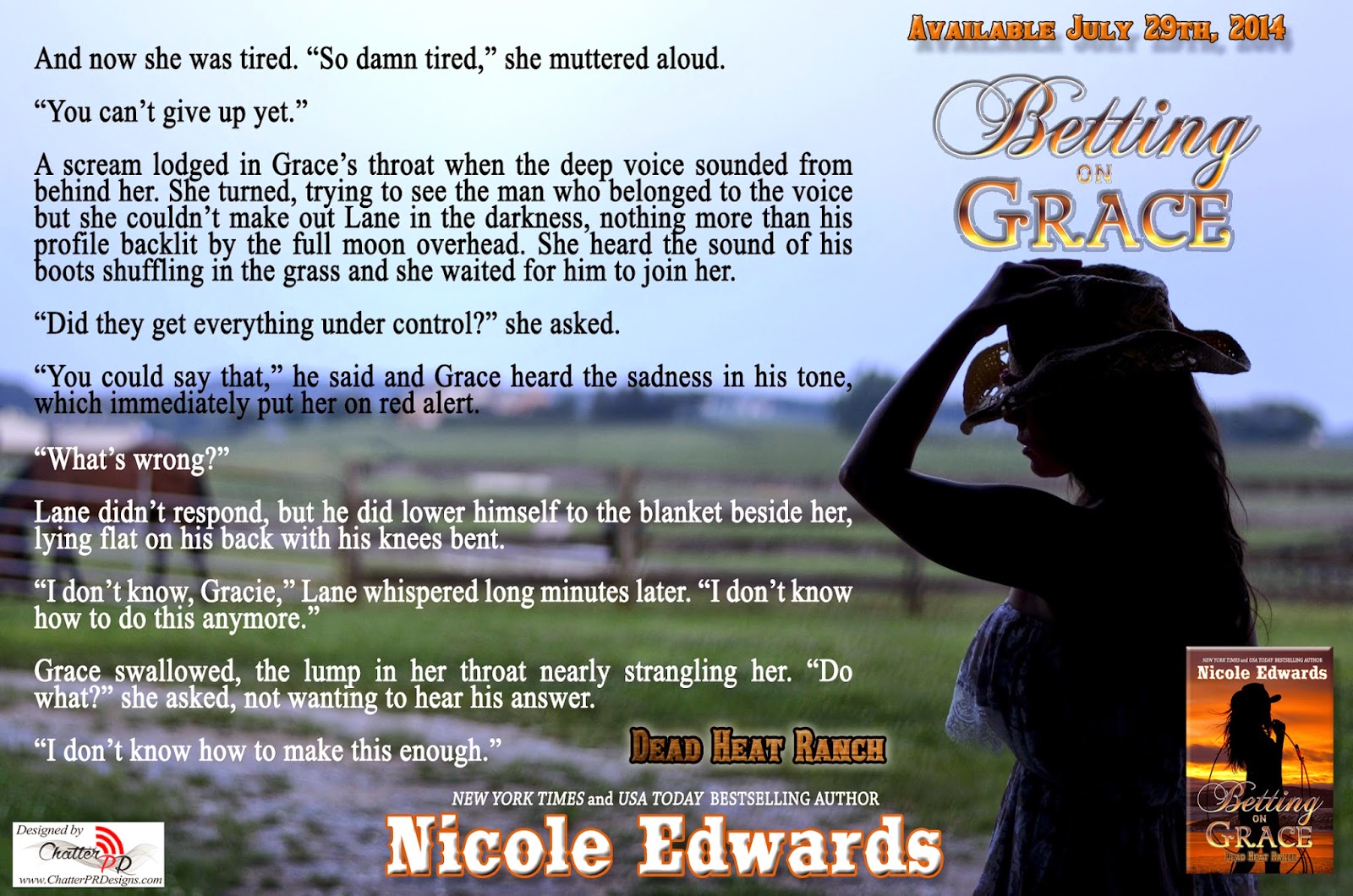 New York Times bestselling author Nicole Edwards is continuing to heat things up with Betting on Grace, a sexy new ménage novel which is the first book in a hot new series called Dead Heat Ranch.